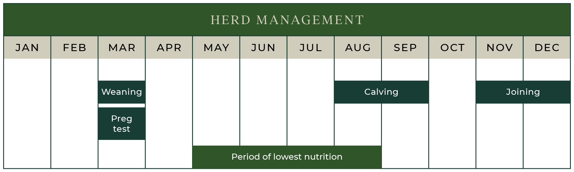 The joining period for the bulls to go in with cows is set on the 21st October for 6 weeks for heifers and 9 weeks for cows. These dates are set for calving and peak lactation to occur for our cows at the optimum time in our season. “Our frost date is more predictable than our green date” - Peter says. Weaning is therefore carried out in March to enable cows and weaners to go back onto fresh pastures before frosts arrive. This also allows the cow to gain body condition prior to calving in August. We cannot afford to have cows lactating in winter in our environment.